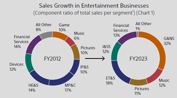 Growth in Entertainment Businesses: Entertainment segments (Games & Network Services, Music, and Pictures) now account for 60% of Sony’s total sales. The proportion of Sony’s total sales from entertainment has grown from 26% in FY2012 to 55% in FY2023.